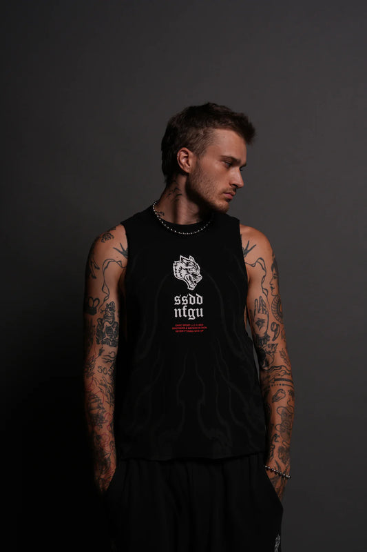 MONTH KANJ GRUNGE RAW CROPPED "TOMMY" MUSCLE TEE IN BLACK